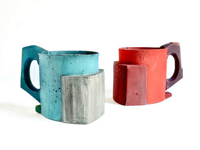 In the first, abstracted utilitarian vessels are layered with bold color, giving them the presence of 3-dimensional Color Field paintings. These forms are inspired by modernist architecture and meant to be used in domestic spaces Their unconventional appearance may require an intentional adventurous approach when putting them into use.