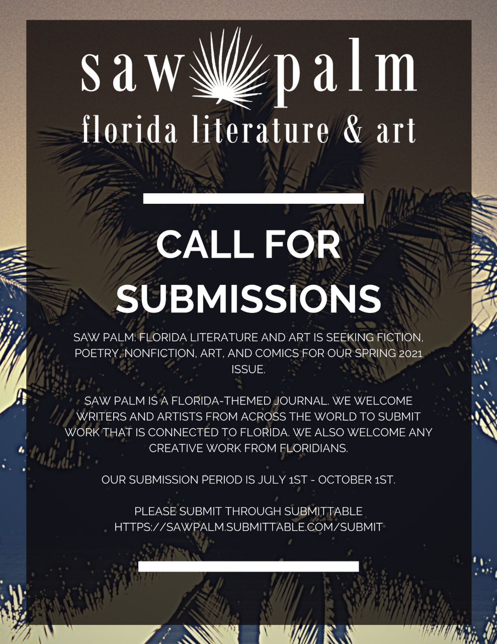 Gabrielle Grilli, poetry editor for Saw Palm, and Managing Editor, Kat Lewis, are announcing the opening of Saw Palm’s submission period. You are invited to submit work for their fifteenth issue. Saw Palm is accepting submissions through Oct. 1st via their submission portal. Unique publication opportunities are also offered on their website, such as “Places To Stand,” their literary map of Florida.