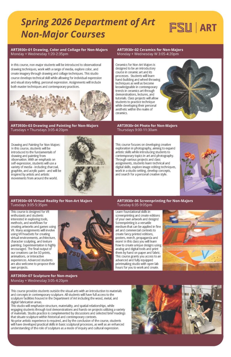 The Department of Art at FSU is happy to offer 7 Non-Major courses in the Spring 2026 term!